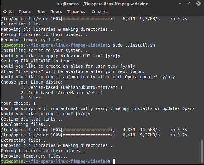 В дистрибутивах на основе Debian и Arch скрипт может запускаться автоматически после каждого обновления или переустановки браузера Opera. После запуска скрипта на все вопросы можно ответить согласием, напечатав букву "y". В последнем вопросе нужно будет указать используемый дистрибутив: 1 – при использовании Debian подобных систем (Debian/ Deepin/Ubuntu/Mint) и 2 – для Arch подобных систем (ArchLinux, Manjaro и т.д).