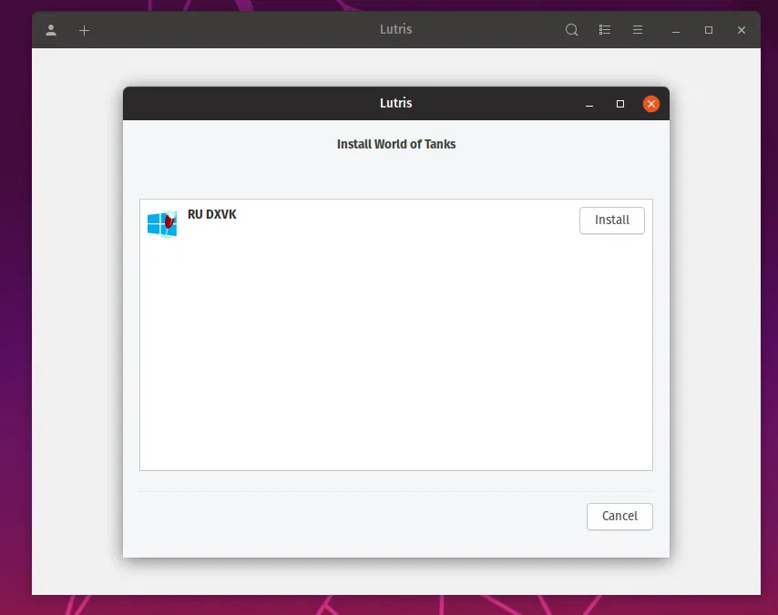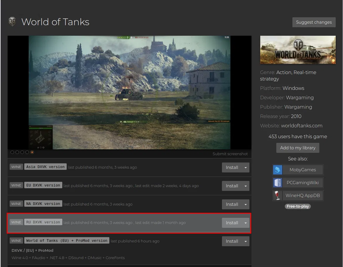 Найдя игру, выбираем (если доступно) редакцию скрипта с нужным нам сервером (например для World of Tanks это будет RU DXVK version). Нажимаем на Install. В качестве примера будет показана установка игры World of Tanks в Ubuntu 19.04.