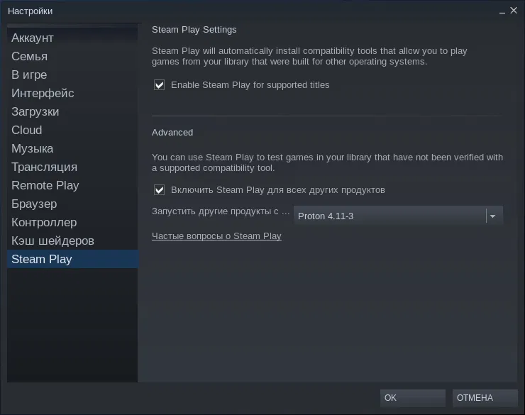 Для включения опции Proton, нам необходимо открыть Steam – затем Настройки – Steam Play – и включить доступные опции.