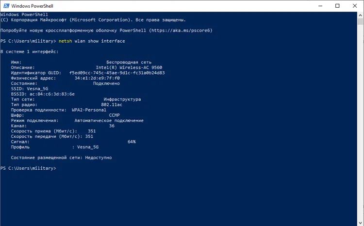 Однако, если вы хотите узнать уровень Wi-Fi сигнала в процентном соотношении, то для этого нужно открыть Командную строку (cmd.exe) или PowerShell и выполнить следующую команду: