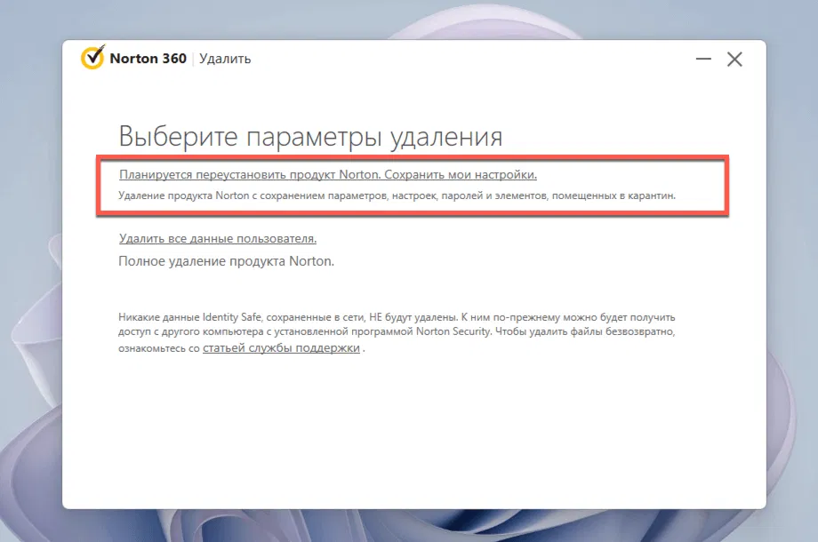 3. Установите новую версию поверх с сохранением ваших данных, выбрав Планируется переустановить продукт Norton. Сохранить мои настройки.. После перезагрузки системы завершите установку.