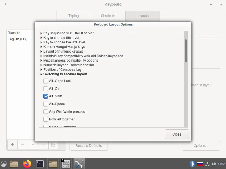 Русская раскладка клавиатуры с английской локализацией рабочего стола, не самый удобный способ изучения системы. Поэтому нажав на значок раскладки и выбрав Keyboard Settings мы откроем настройки для добавления английской раскладки (в подразделе настроек Layouts) и в том же окне, но опции Options, добавим сочетание клавиш для смены раскладки.