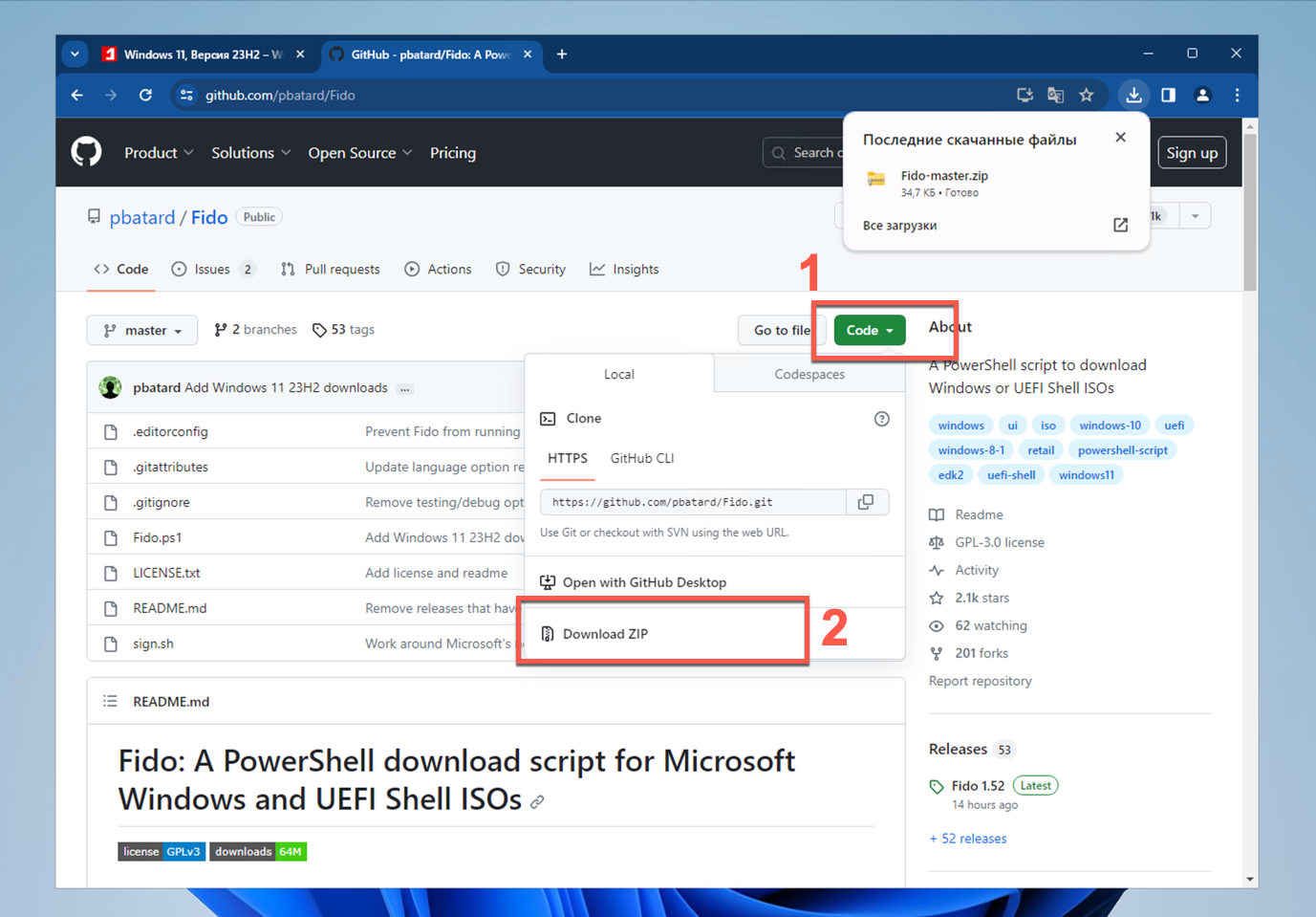 Скачать Fido можно следующим способом. Перейдите на соответствующую страницу GitHub, выберите меню «Code > Download ZIP». После скачивания распакуйте архив Fido-master.zip.