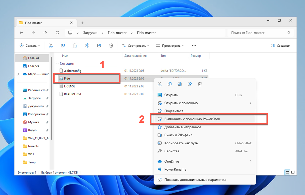 В полученной папке «Fido-master» кликните по скрипту «Fido.ps1» правой кнопкой мыши и выберите опцию «Выполнить с помощью PowerShell». Вы также можете запустить PowerShell и указать путь к скрипту для его запуска.