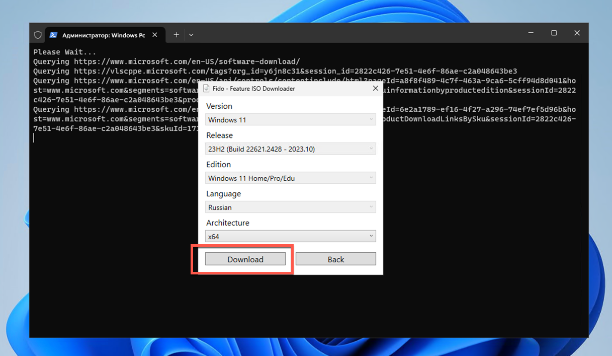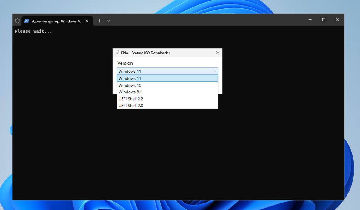 При выполнении скрипта сначала появляется окно Please Wait... Спустя несколько секунд откроется новое окно Fido – Feature ISO Downloader.