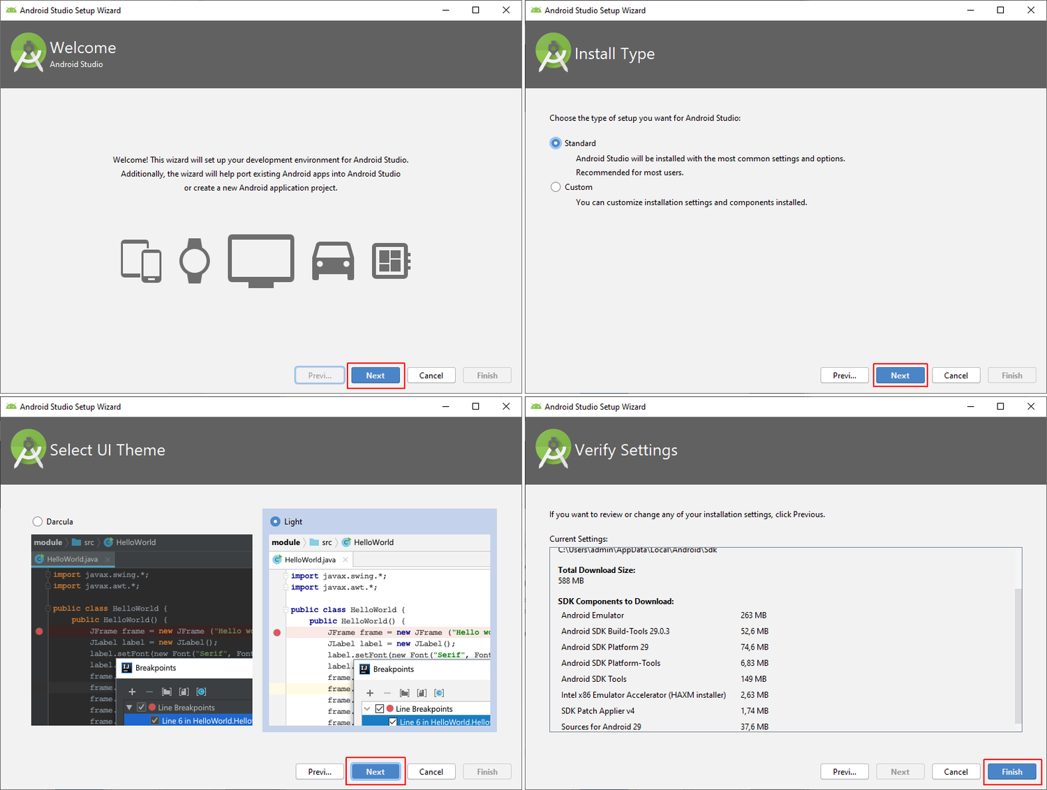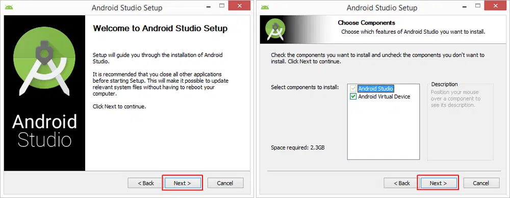 Запустите установочный файл Android Studio. Нажмите Next в окне приветствия и, не меняя состав установки, снова нажмите Next.