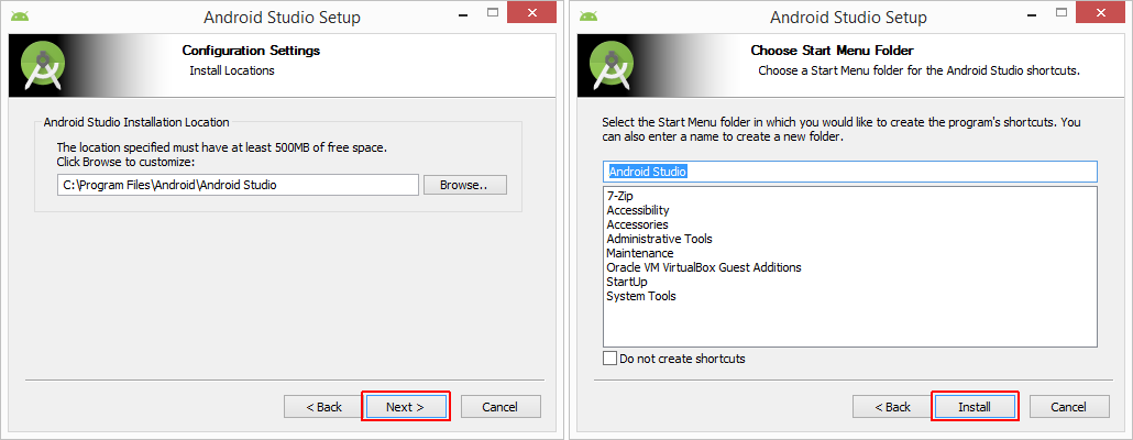 На следующем этапе, вы можете изменить путь установки Android Studio. Нажмите Next для продолжения и Install для запуска установки.