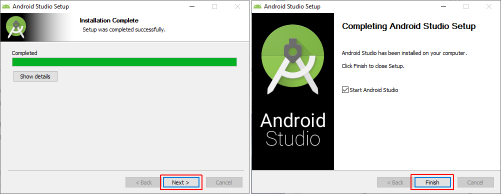 После завершения установки нажмите Next, отметьте пункт "Start Android Studio" и нажмите Finish.