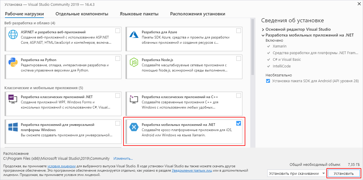 Установить Visual Studio будет проще, так как установщик и сами средства разработки будут на русском языке. После запуска установочного файла, нажмите "Продолжить" и дождитесь завершения скачивания дополнительных файлов. Затем, в главном окне выбора компонентов, отметьте пункт "Разработка мобильных приложений на .NET" и нажмите "Установить".