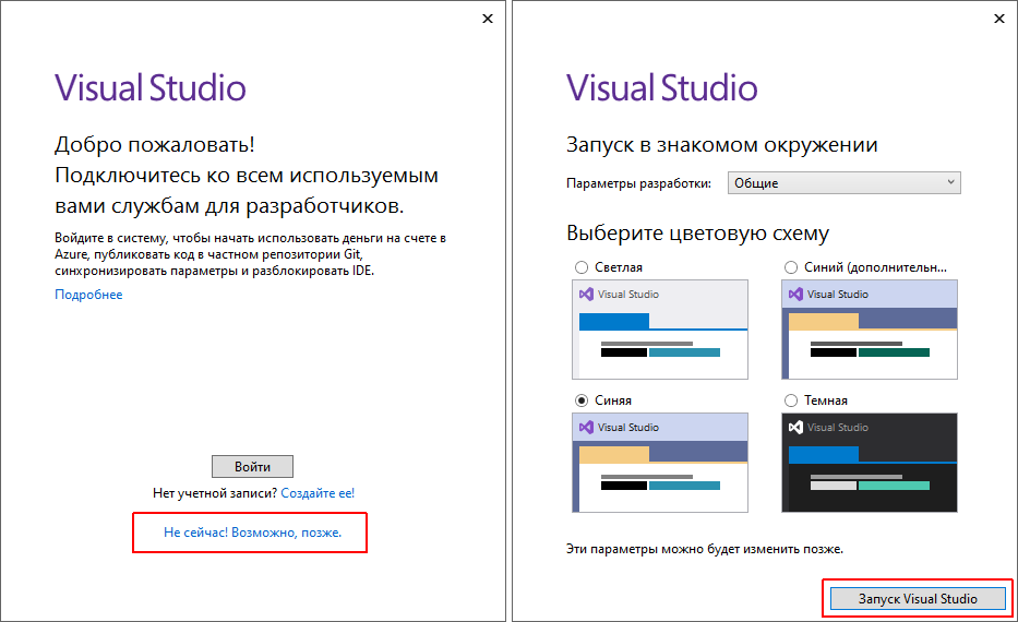 Процесс установки может занять продолжительное время. Когда установка будет завершена, вы получите приглашение подключится к службам для разработчиков. Нажмите "Не сейчас! Возможно, позже" и затем "Запуск Visual Studio".