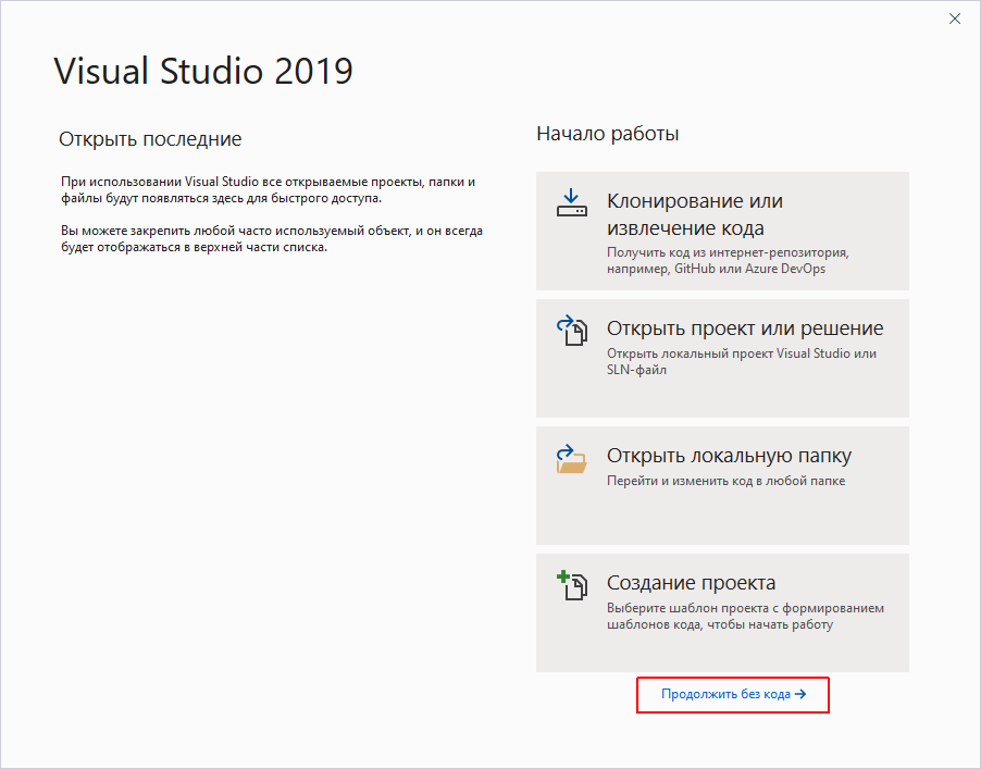 В стартовом окне, нажмите "Продолжить без кода" для запуска программы Visual Studio.