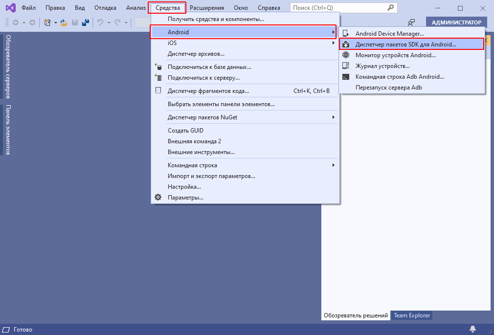 Теперь вам нужно проверить что в Visual Studio установлены все необходимые инструменты разработки для Android. В верхнем меню нажмите "Средства" - "Android" - "Диспетчер пакетов SDK для Android...".