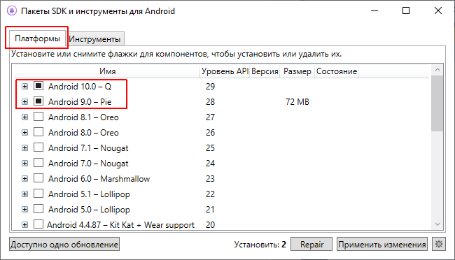 Убедитесь, что установлены все необходимые компоненты. Понадобятся SDK для Android 9 и Android 10) на вкладке "Платформы".