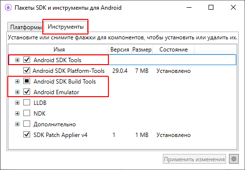 А также "Android SDK Tools", "Android SDK Build Tools" и "Android Emulator" на вкладке "Инструменты".