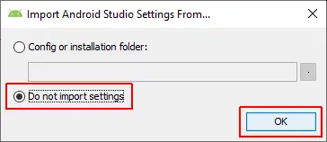 После установки, вам будет предложено импортировать настройки Android Studio. Пропустите этот шаг, выбрав "Do not import settings" и нажав "OK".