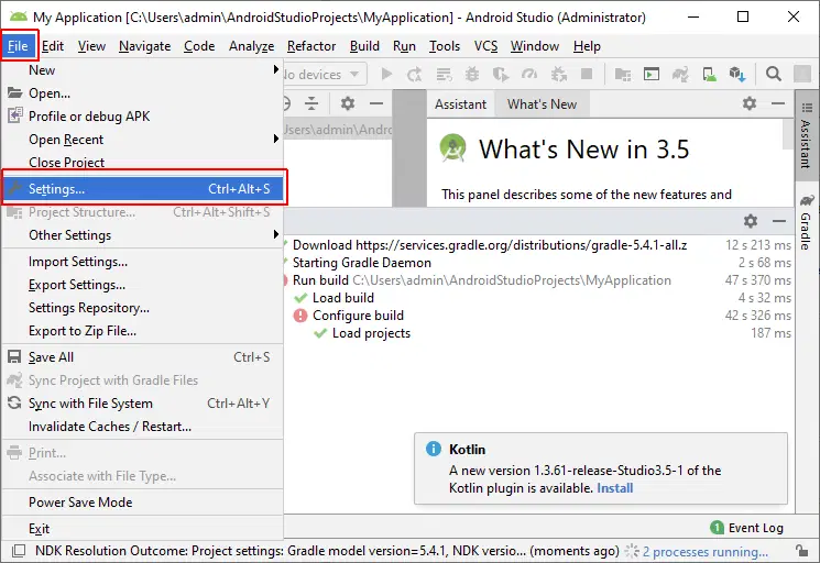 Когда загрузится новый проект, откройте настройки Android Studio. В меню "File" выберите пункт "Settings".