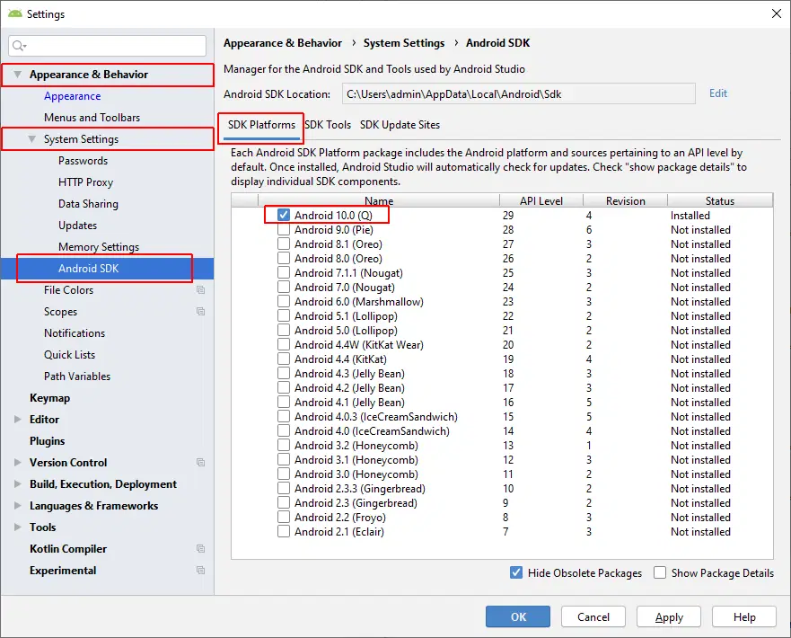 В окне настроек, перейдите по меню "Appearance & Behavior" - "System Settings" - "Android SDK". На вкладке "SDK Platforms" должен быть отмечен пункт "Android 10.0 (Q)".