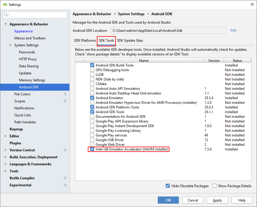Также, на вкладке "SDK Tools" должен быть отмечен пункт "Intel x86 Emulator Accelerator"