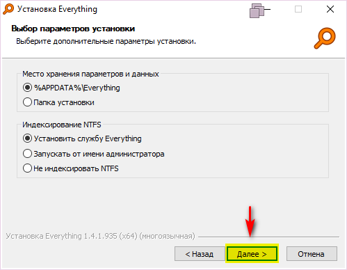- В первом окне Выбор параметров установки рекомендуется оставить значения по умолчанию. Но при необходимости можно изменить директорию для хранения данных и настроек программы Everything и параметры индексирования. Также эти параметры можно изменить и по окончании установки программы в ее настройках.