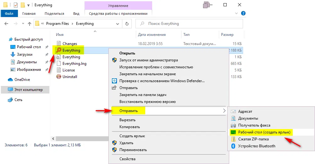 Если по окончании установки ярлык программы не появился на рабочем столе (несмотря на установленный флажок в чекбоксе Ярлык на рабочем столе при указании параметров), его можно создать самостоятельно, перейдя в директорию C:\Program Files\Everything или C:\Program Files (x86)\Everything (в зависимости от разрядности операционной системы и программы, которая была установлена), ПКМ выбрать приложение Everything и в контекстном меню выбрать Отправить > Рабочий стол (создать ярлык).
