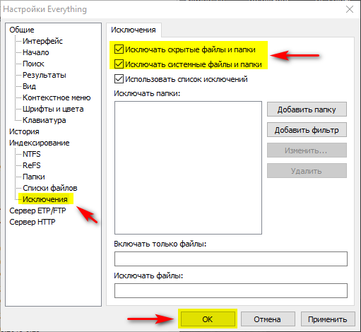 Чтобы сузить область поиска, можно исключить скрытые и системные файлы и папки. Для этого необходимо открыть настройки программы (в главном меню программы выбрать Сервис > Настройки), перейти в раздел Исключения и установить флажки в чекбоксах Исключать скрытые файлы и папки и Исключать системные файлы и папки и нажать ОК. Также в данном разделе можно прописать конкретные папки или файлы, которые необходимо исключить из поиска.