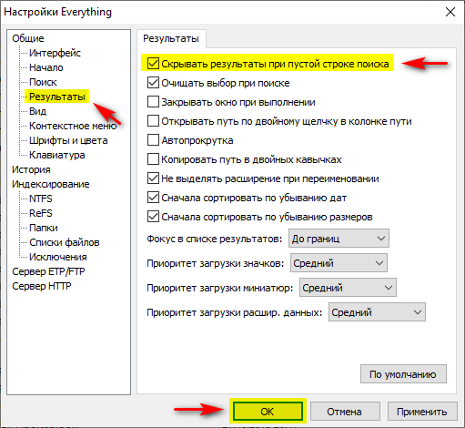 Чтобы при каждом запуске программы, пока еще не была введена никакая информация для поиска, не отображались список всех существующих файлов, можно активировать настройку Скрывать результаты при пустой строке поиска. В настройках программы перейти в раздел Результаты и установить соответствующий флажок в чекбоксе.