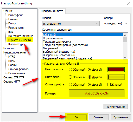 Рис.13 Настройка цвета фона и шрифта в программе Everything