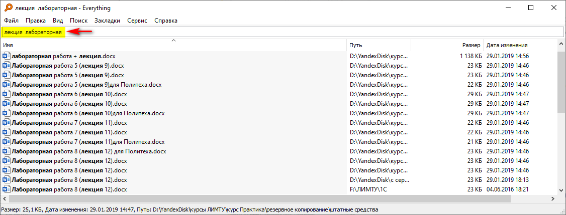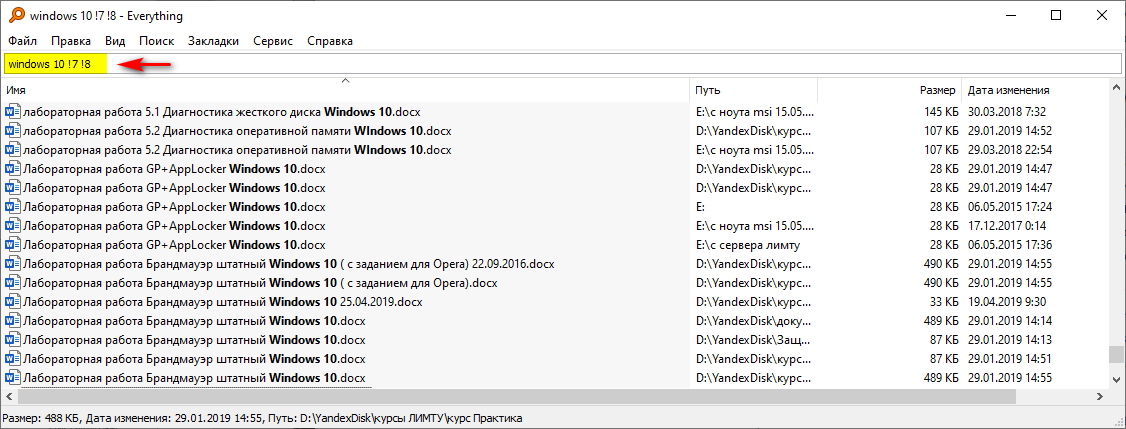 Таким образом, если указываются несколько слов через пробел, применяется оператор AND (знак пробел), например, лекция лабораторная, будут найдены все файлы и папки, где одновременно будут присутствовать слова лекция и лабораторная.