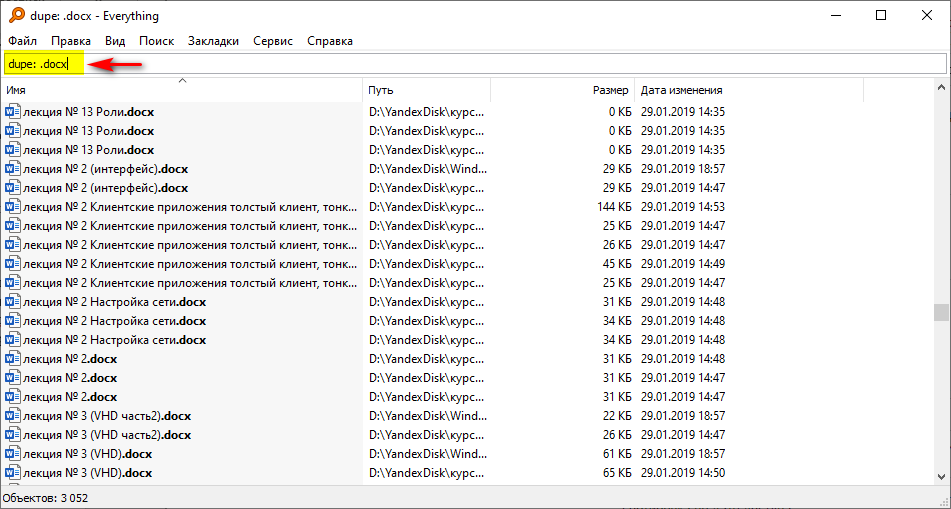Если необходимо найти файлы .docx с одинаковыми именами, достаточно в поиске ввести dupe: .docx и будет выведен список всех дублирующийся документов формата .docx. По этому же принципу можно найти файлы с любым расширением, например, dupe: .mp3 или dupe: jpeg и т.д. Поиск дубликатов будет осуществлен по всему индексу, а не среди текущих результатов.
