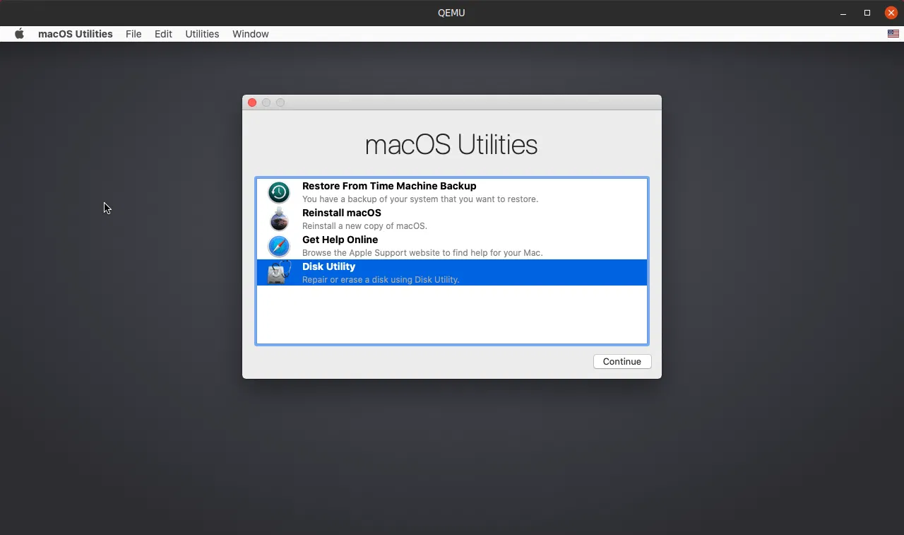 Дальше в ходе запуска виртуальной машины, откроется окно macOS Utilities, в котором доступны различные инструменты.