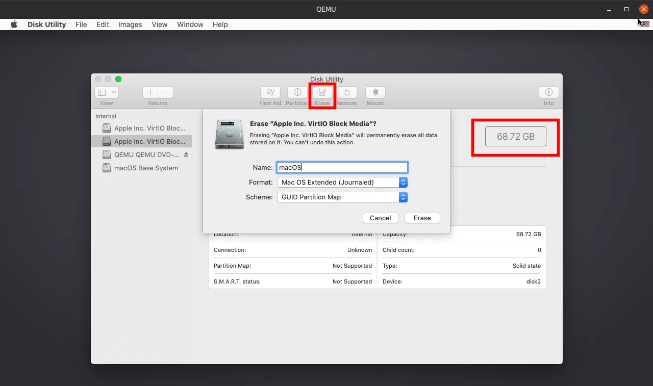 В диалоговом окне «Disk Utility» на панели с левой стороны, выберите жесткий диск Apple Inc. Virtio (тот, что имеет емкость 68,72 ГБ), затем нажмите Erase, введите имя для жесткого диска (например, macOS) и оставьте остальные параметры без изменений.