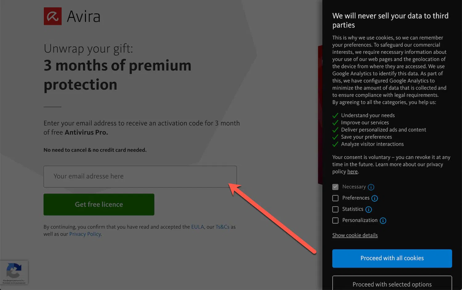 1. Перейдите на страницу промо-акции (на английском языке), нажмите кнопку Proceed with all cookies и укажите электронную почту (будет использоваться для вашего аккаунта Avira).