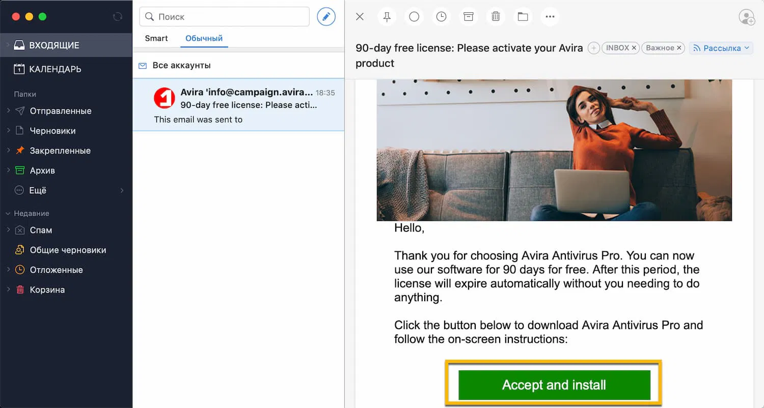 3. В полученном письме перейдите по ссылке Accept and install и выполните регистрацию нового аккаунта Avira.