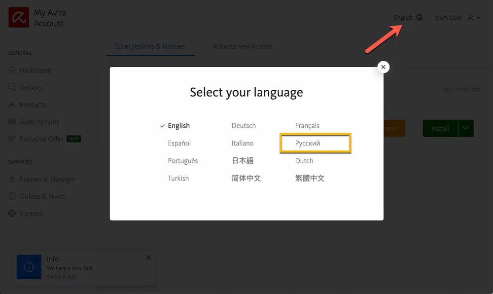 4. После регистрации поменяйте язык интерфейса на русский. Для этого, нажмите по значку с планетой в правом верхнем углу и во всплывающем окне выберите Русский.