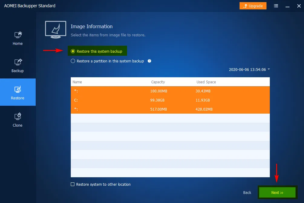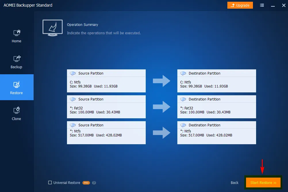 - При восстановлении системного раздела, а также дополнительных скрытых разделов, необходимо оставить радиокнопку Restore this system backup по умолчанию и нажать кнопку Next, а затем Start Restore для запуска восстановления.