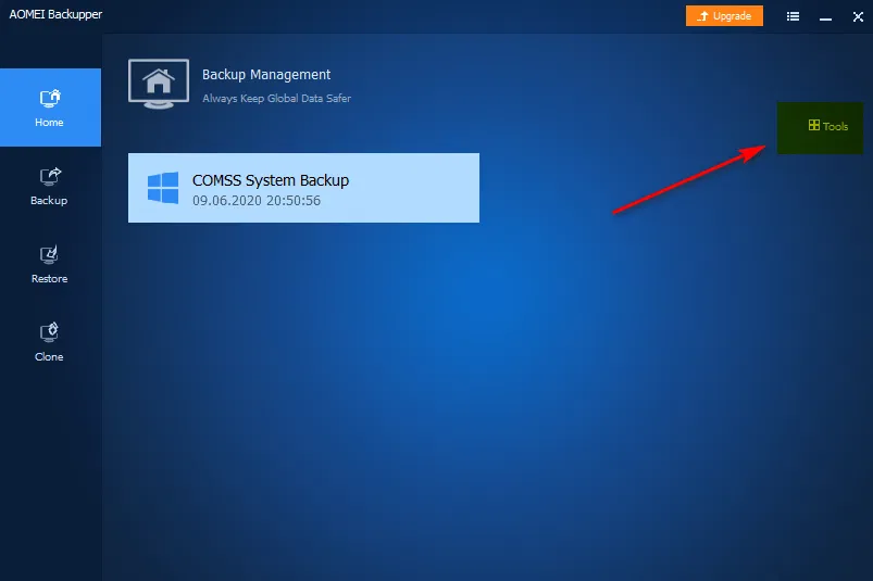 В верхней правой части главного окна необходимо нажать на пиктограмму Tools, чтобы раскрыть список дополнительных средств программы AOMEI Backupper Standard.