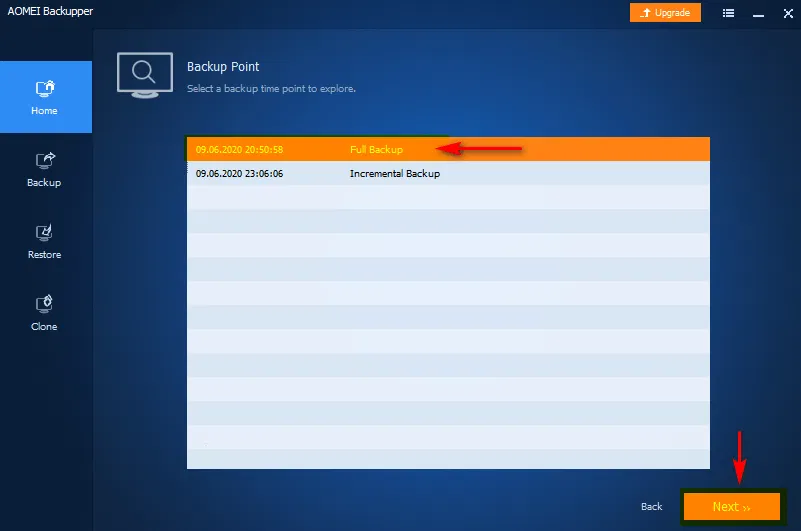 - В случае создания дифференциальных или инкрементных резервных копий на основе полной резервной копии, необходимо указать нужную, можно ориентироваться на время создания. Нажать кнопку Next.