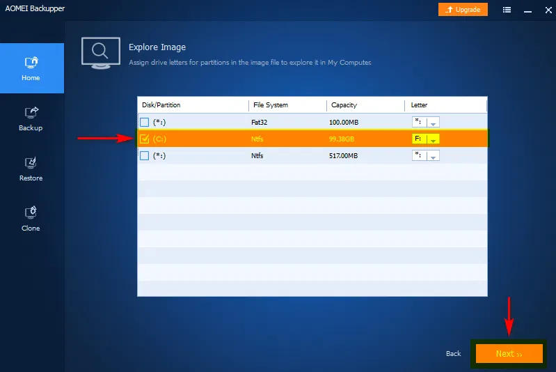 - Выбрать нужный раздел для исследования (для каждого раздела можно указать свободную букву диска, которая будет присвоена при монтировании образа) и нажать Next