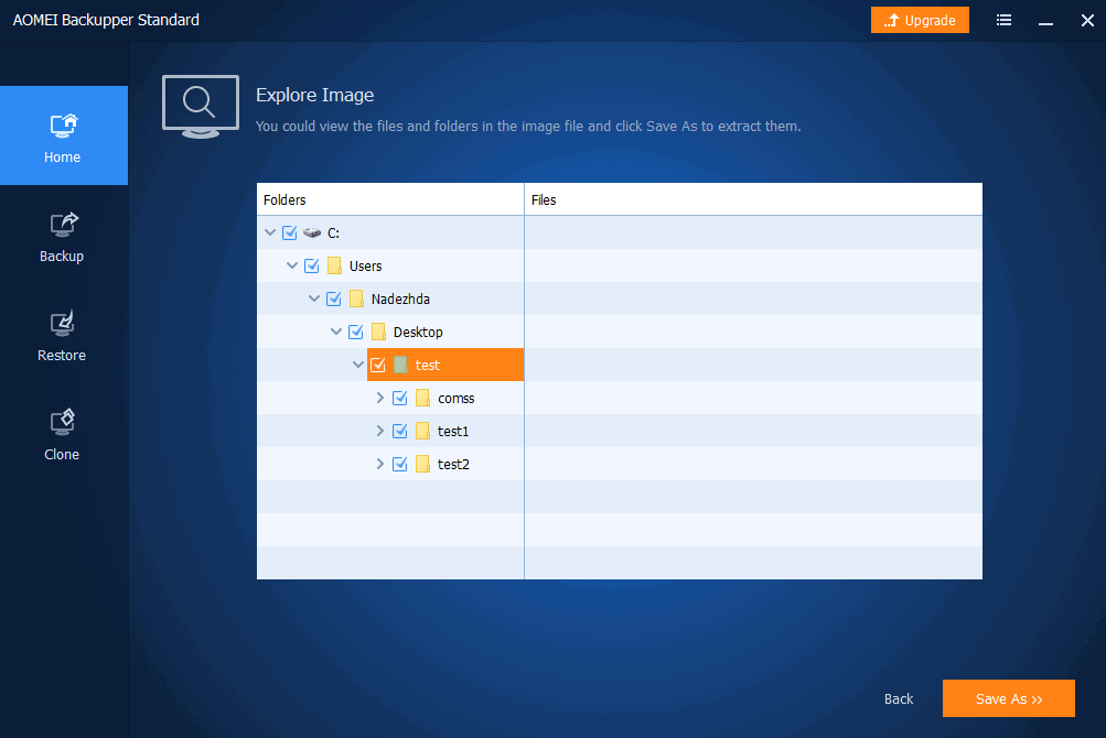 Если ранее создавалась резервная копия файлов и папок, то образ резервной копии не монтируется, как виртуальный диск. Операция с файлами и папками при подключении образа производится через основное окно программы, где есть возможность сохранить выбранные папки и файлы.