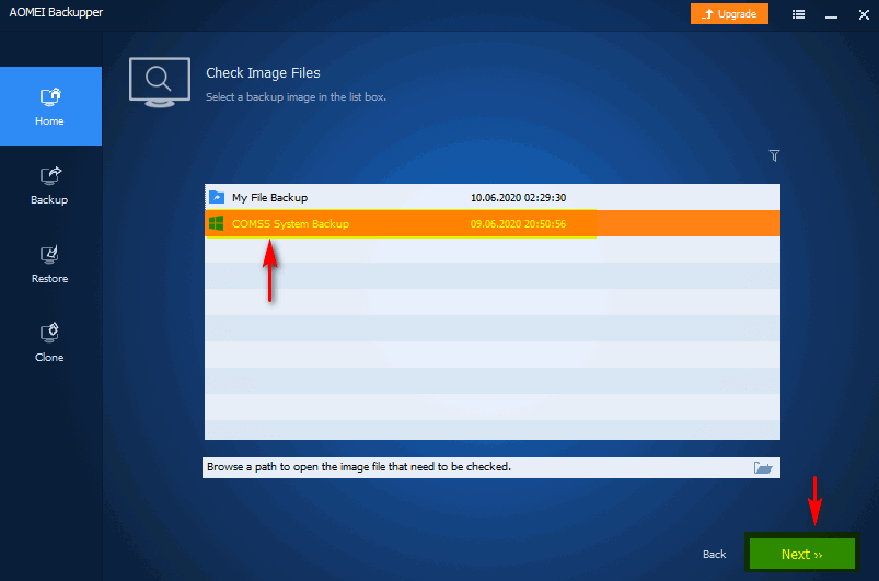 - Выбрать резервную копию для проверки и нажать кнопку Next