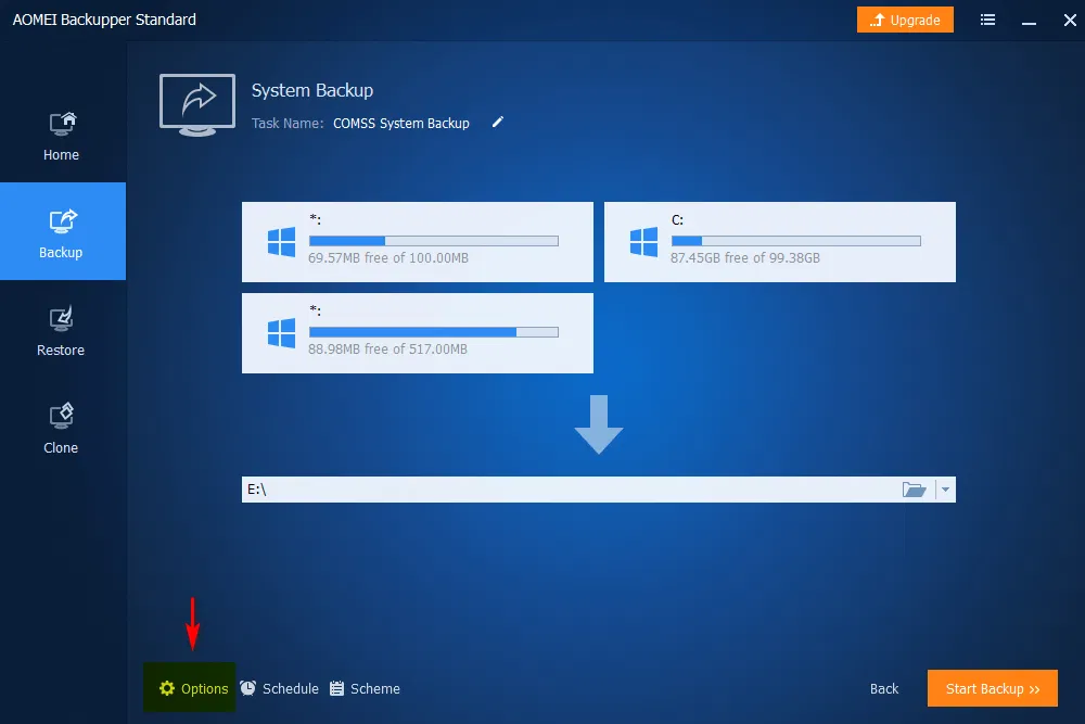 Перед запуском создания резервной копии можно настроить дополнительные параметры, выбрав Options в левом нижнем углу интерфейса.