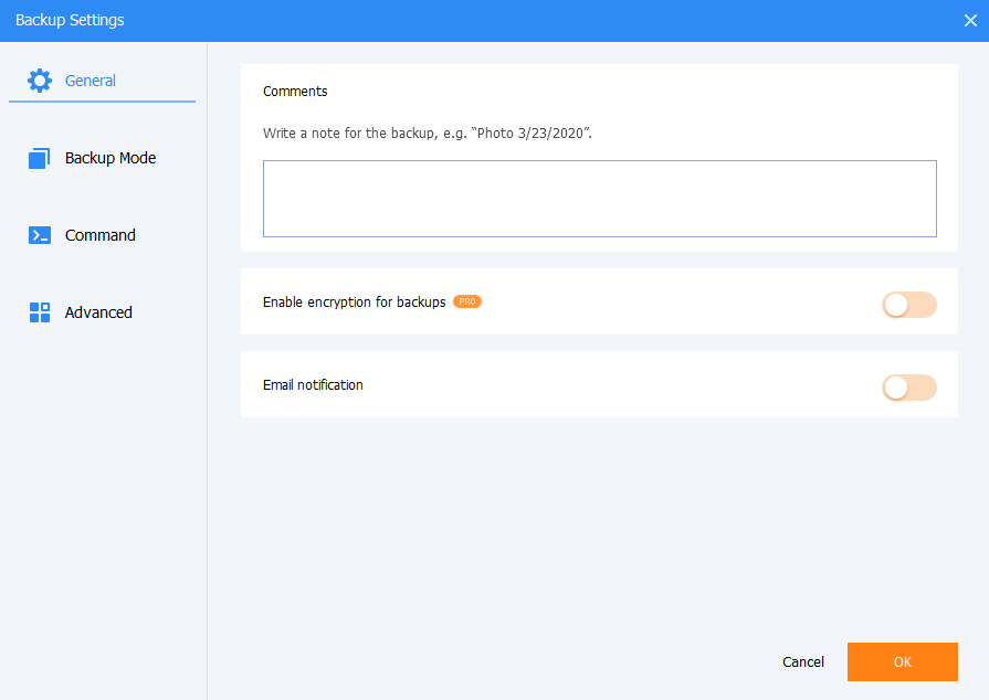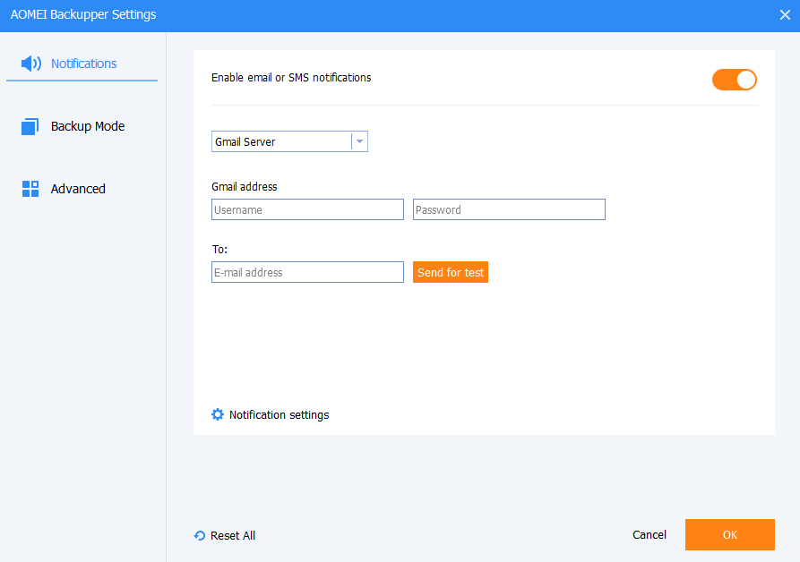 В разделе General можно настроить такие параметры, как Comments для добавления комментария к резервной копии, а также Email notification для отправки уведомлений по электронной почте. Редакция Standard поддерживает только SMTP-серверы Gmail и Hotmail. Для указания необходимых параметров электронной почты можно открыть настройки программы в правом верхнем углу интерфейса, выбрать Settings > Notifications.