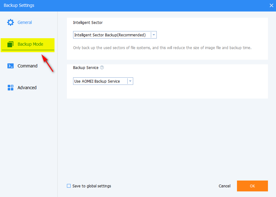 В раскрывающемся списке параметра Intelligent Sector доступно два способа создания резервной копии системного раздела: