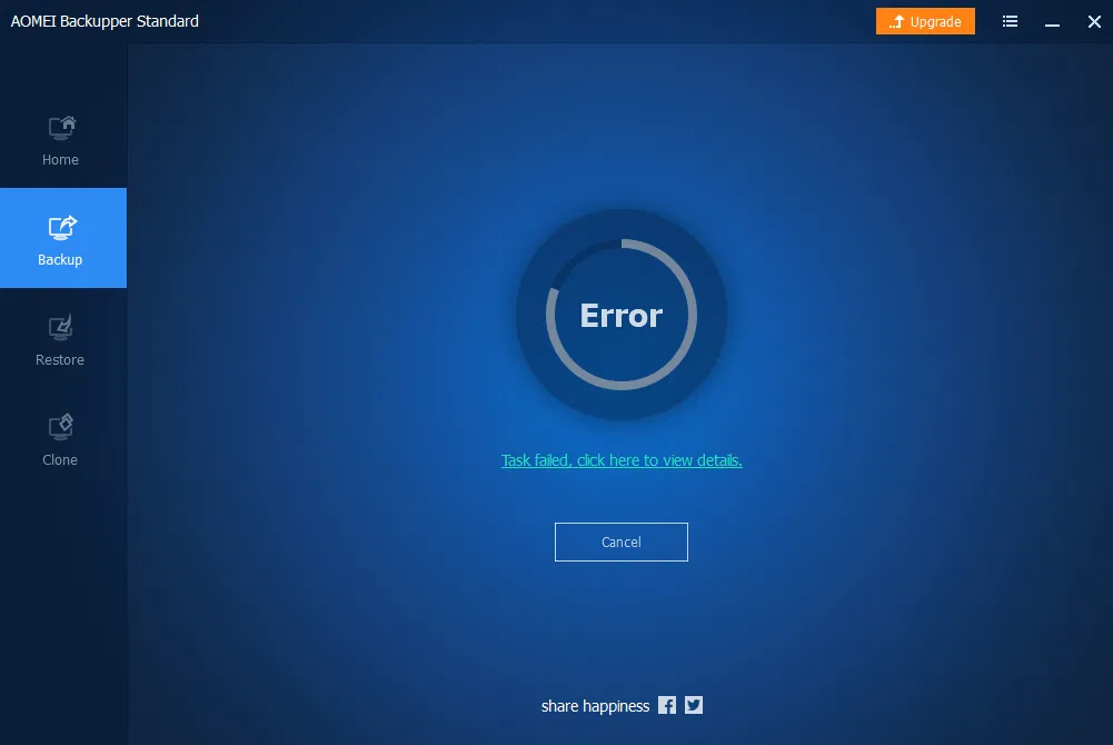 Рис.17 Ошибка при создании резервной копии в среде рабочей операционной системы в случае выбора режима Use AOMEI Backup Service