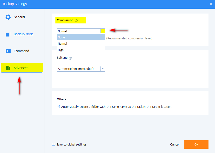 В разделе Advanced параметра Compression можно настроить режим сжатия данных при создании резервной копии.