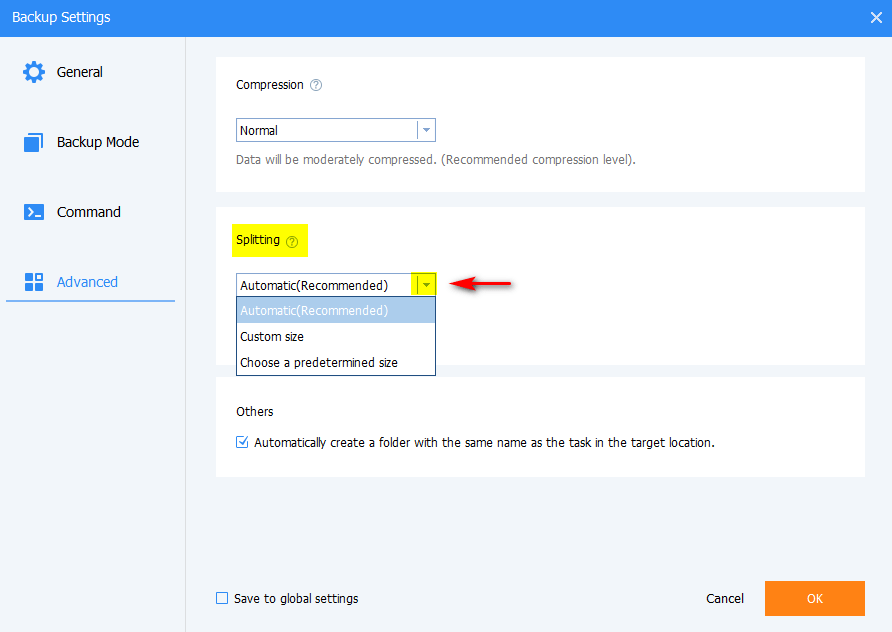 Файлы резервных копий можно разбить на несколько файлов меньшего размера, чтобы разместить их на нескольких носителей. Для этой задачи можно настроить параметр Splitting.
