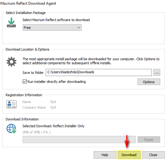 В данном окне можно выбрать редакцию устанавливаемой программы. Статья посвящена Macrium Reflect 7 Free, поэтому раздел Select Installation Package остается без изменений. В разделе Download Location & Options можно указать папку, куда необходимо загрузить инсталляционный файл программы. Если оставить флажок в чекбоксе Run installer directly after downloading по умолчанию, по окончании загрузки автоматически начнется установка программы. Нажать кнопку Download.