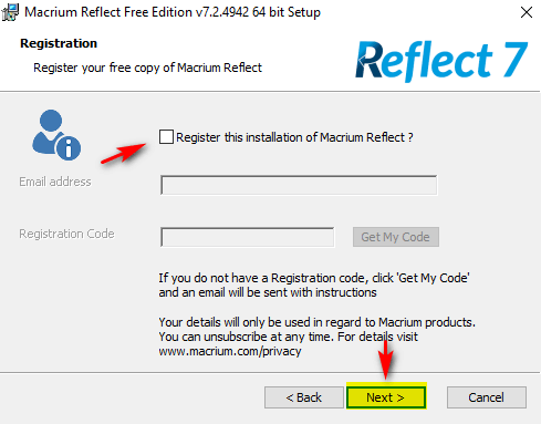 В следующем диалоговом окне можно снять флажок в чекбоксе Register this installation of Macrium Reflect и нажать кнопку Next.
