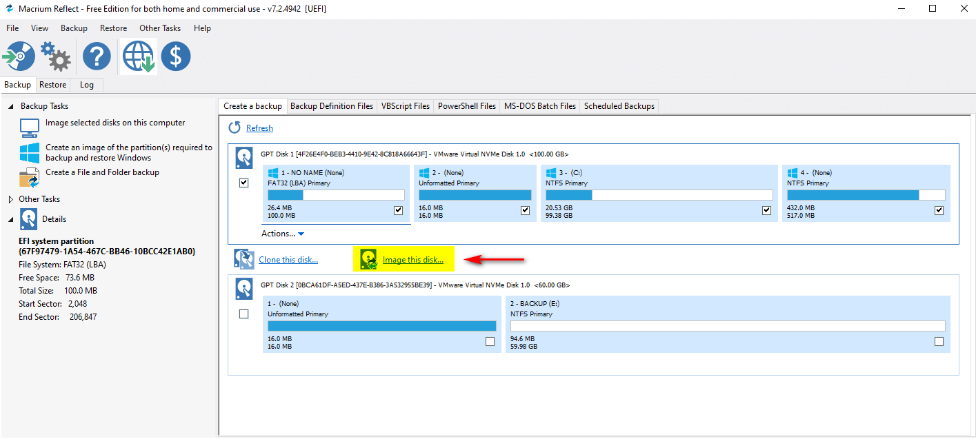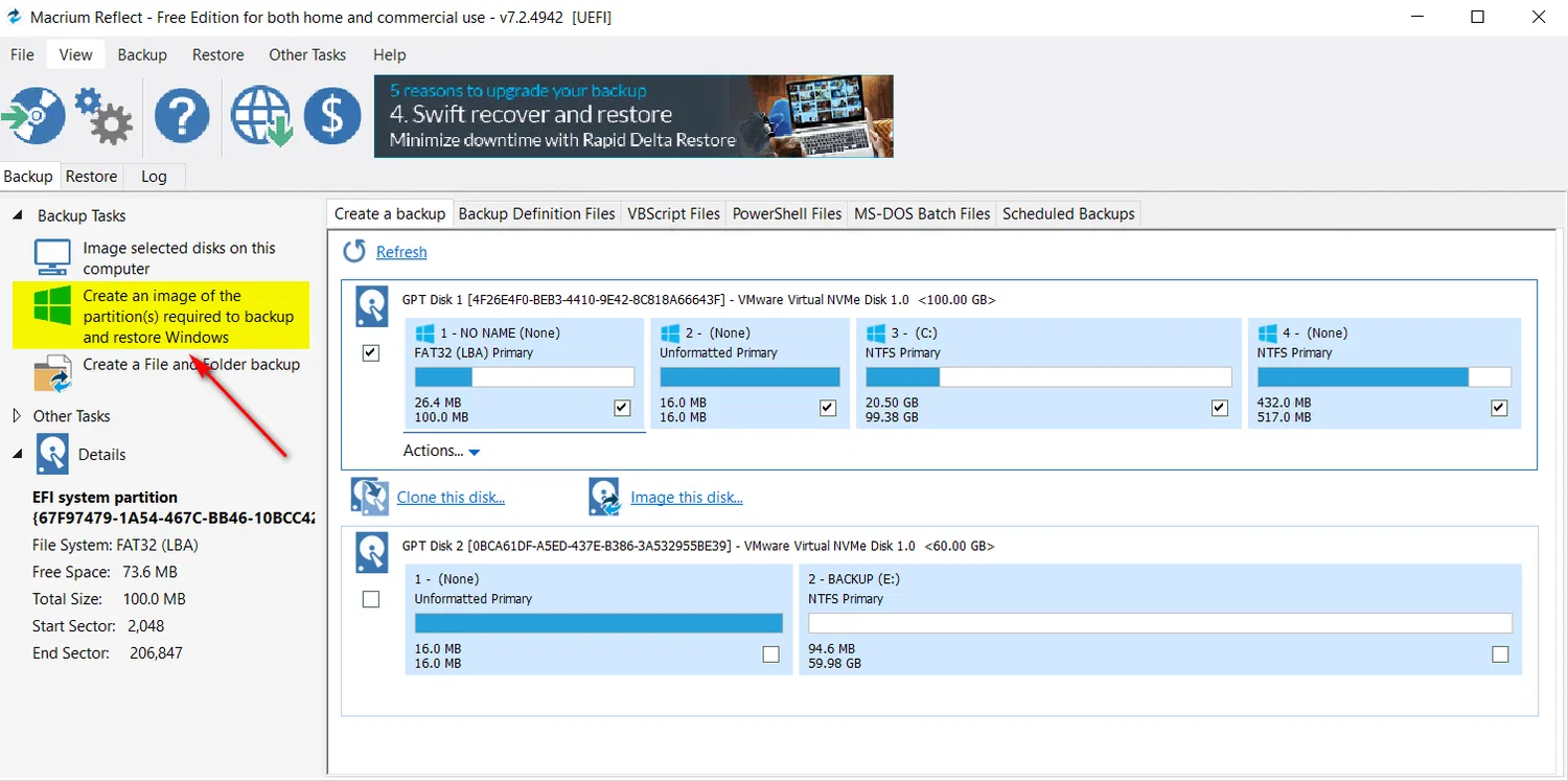 - В главном окне программы Macrium Reflect на вкладке Backup раздела Backup Tasks выбрать Create an image of the partition(s) required to backup and restore Windows.