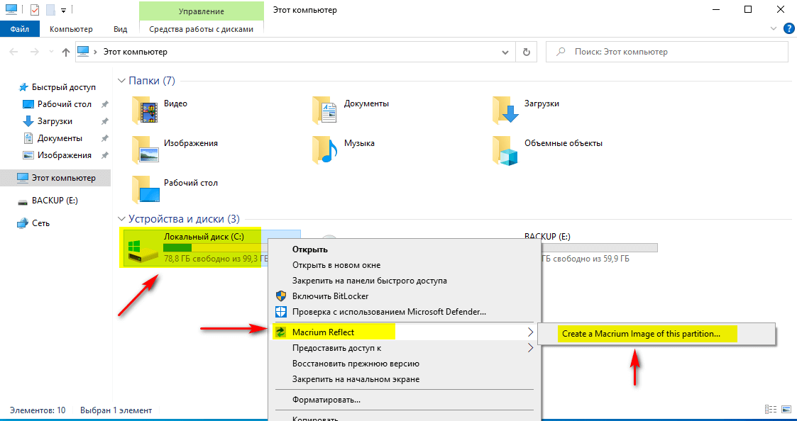 - В проводнике правой клавишей мыши открыть контекстное меню системного раздела, выбрать Macrium Reflect > Create a Macrium Image of this partition
